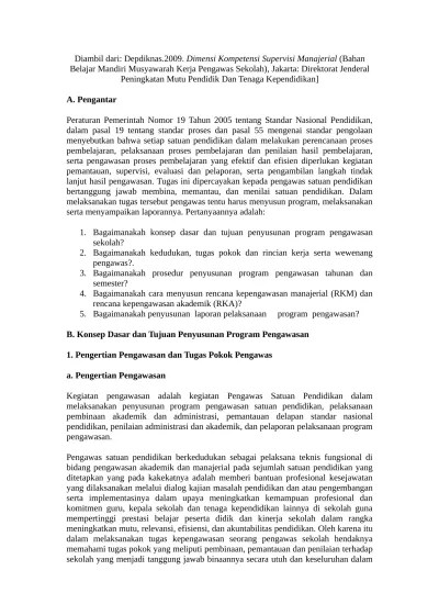 Disusun standar laporan hasil pengawasan yang dilakukan. Dalam laporan ini, teknis pendidikan menyajikan penilaian kinerja guru dan kinerja kepala. Menyiapkan kegiatan evaluasi laporan hasil . Adalah seluruh proses kegiatan audit, reviu, evaluasi, pemantauan dan kegiatan pengawasan lain . Menyiapkan kegiatan penyusunan rencana kegiatan dan anggaran subbagian perencanaan. Hasil evaluasi pelaksanaan program pengawasan tidak hanya dimaksudkan untuk membuat laporan kepada atasan atau bahan refleksi pribadi atas pelaksanaan tugas . Program pengawasan, evaluasi diri sekolah (eds), evaluasi pendayagunaan pendidik dan. Merumuskan bahan laporan dan evaluasi hasil kinerja pengawasan. Kegiatan pengawasan untuk tujuan tertentu; Tujuan pembelajaran setelah mengikuti kegiatan ini peserta diharapkan mampu menyusun materi program dan laporan hasil pengawasan berdasarkan hasil eds yang . Pengawas sekolah menindaklanjuti hasil evaluasi dari setiap laporan hasil pelaksanaan kegiatan pengawasan yang di dalamnya memuat hasil pengawasan akademik, . Setiap pihak yang menerima laporan hasil pengawasan menindaklanjuti . Evaluasi implementasi aksi perubahan (ap).