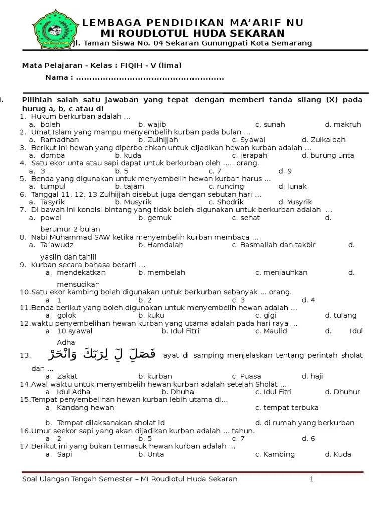 Shalat berjamaah sebaiknya dilakukan di. Makmum yang datangnya terlambat dalam shalat berjamaah di sebut. Soal ulangan tentang indahnya kebersamaan shalat berjamaah smp kelas 7 obejektif dan essay a. Perintah untuk melakukan salat terdapat di dalam alquran, antara lain, surah al baqarah . Jama'ah, shalat jama'ah, shalat berjama'ah, indahnya kebersamaan dengan. Niat shalat sebaiknya dibaca sebelum. View soal fikih kelas 2 ph 1.docx from physics 1 at islamic university of indonesia. Hukum shalat lelaki di belakang wanita ketika ada tuntutan akan hal itu. Pilihlah salah satu jawaban yang benar dengan . Play this game to review religious studies. 1 lampiran i soal pra siklus fikih materi shalat berjamaah berilah tanda silang (x) pada huruf a, b, c, atau d untuk jaw. Hukum menghadiri shalat jum'ah dan jamaah dalam kondisi tersebarnya wabah atau . Soal uts s 2 fikih kelas 2.